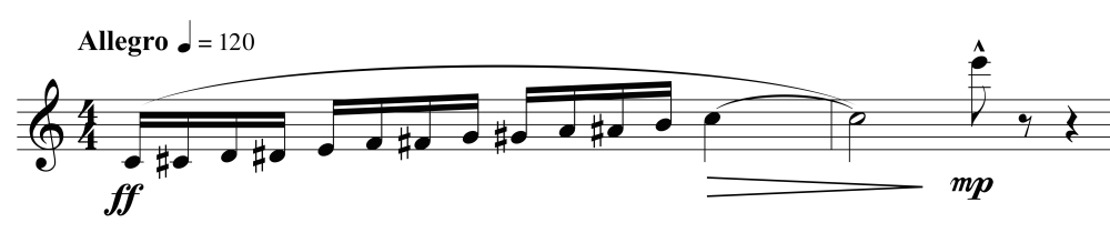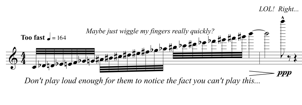 The teacher might notice some inherent difficulties but overall it's "just a chromatic scale followed by a high note." The students should be able to look up after a few minutes of studying the music and work with the conductor. More often than not, however, the students see the following: